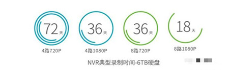 4.分辨率:對(duì)于監(jiān)控?cái)z像頭來說,清晰度很關(guān)鍵。攝像機(jī)的分辨率越大、傳感器像素越高,拍出來的圖像就越清晰。但它所占用的帶寬和內(nèi)存空間也會(huì)更大,同樣大小的硬盤所能錄下的時(shí)間也就越短。以一臺(tái)6T的NVR為例: